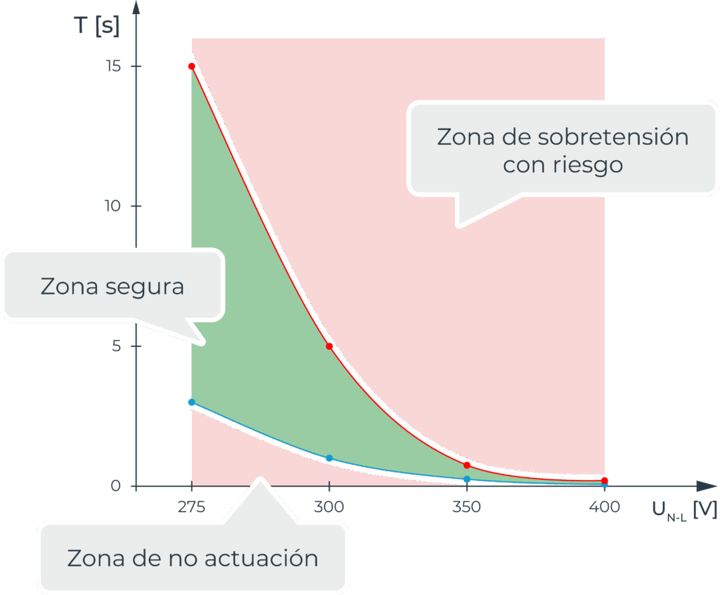 La norma, por tanto, no se limita a exigir el cumplimiento de puntos aislados: el protector debe respetar toda la curva de actuación, asegurando una respuesta progresiva y coherente frente a cualquier nivel de sobretensión permanente.